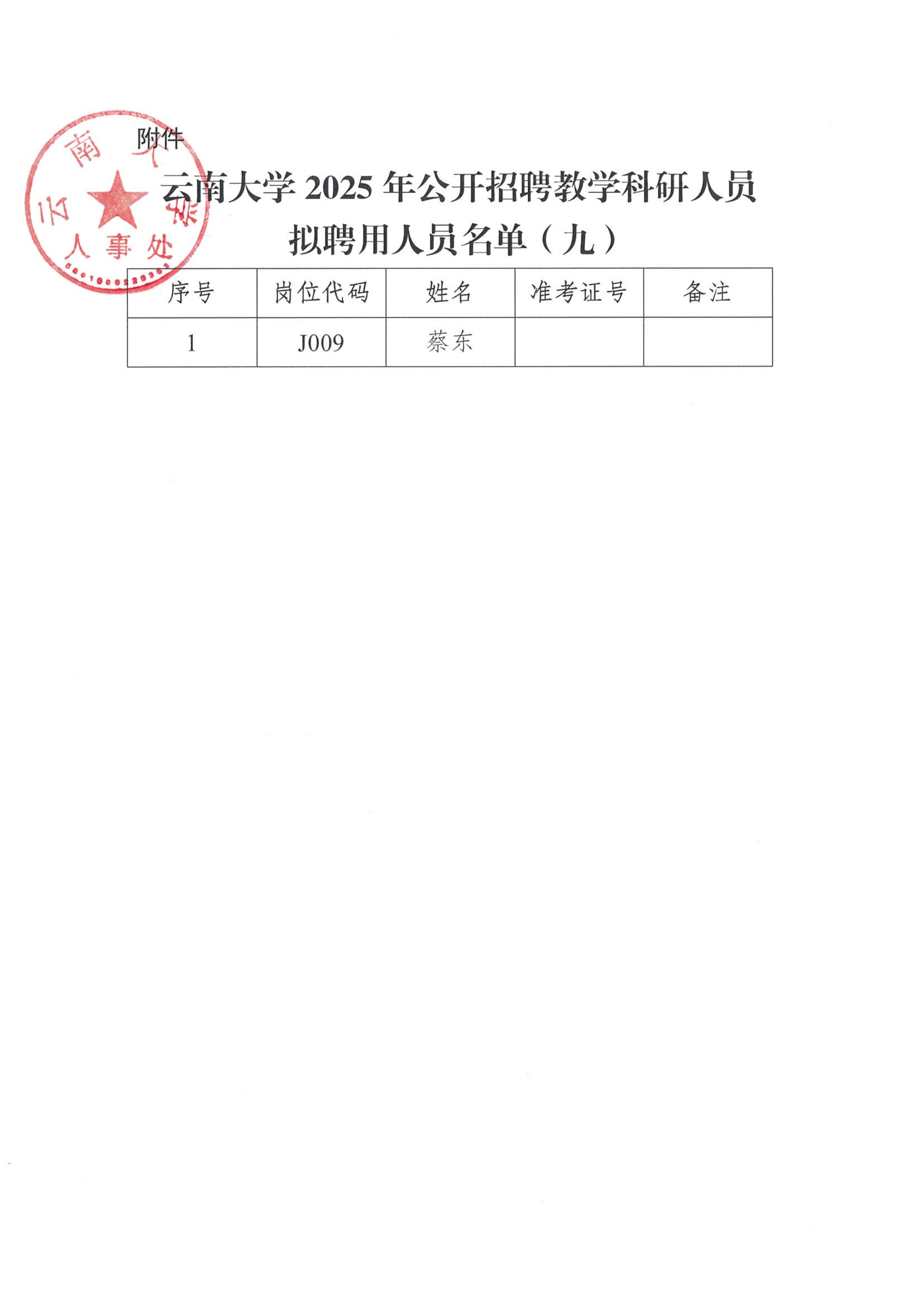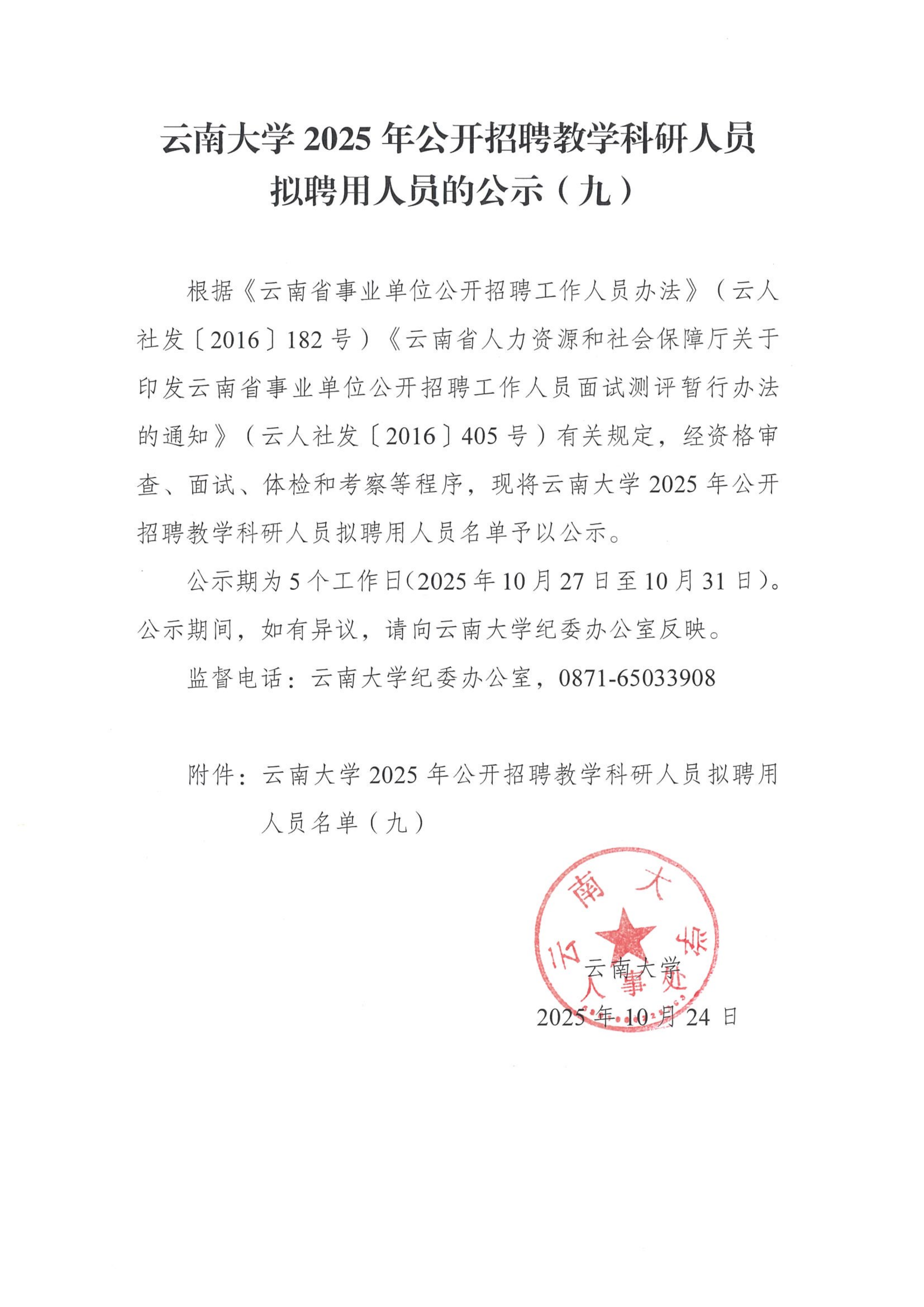 云南大学2025年公开招聘教学科研人员拟聘用人员的公示(九)