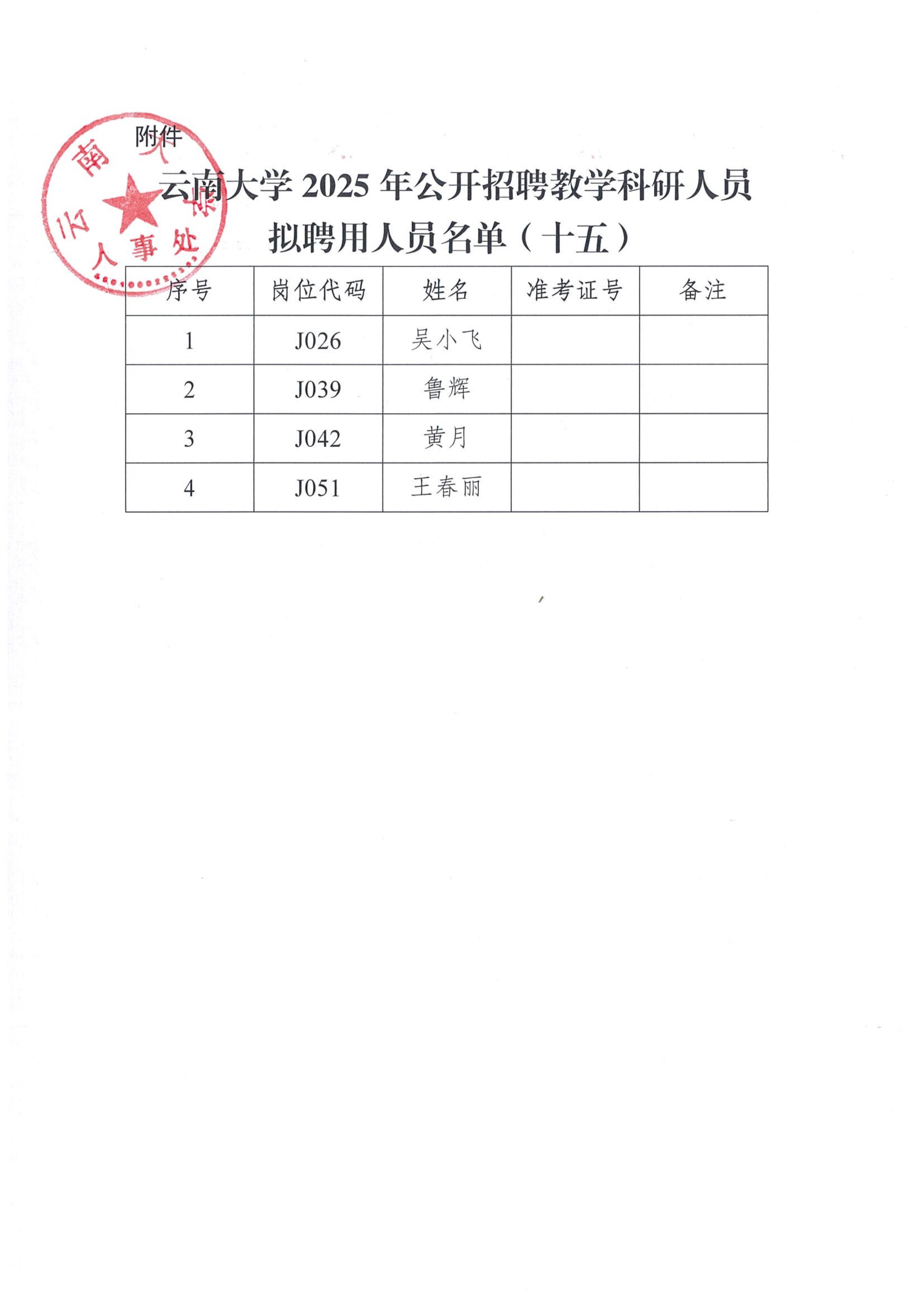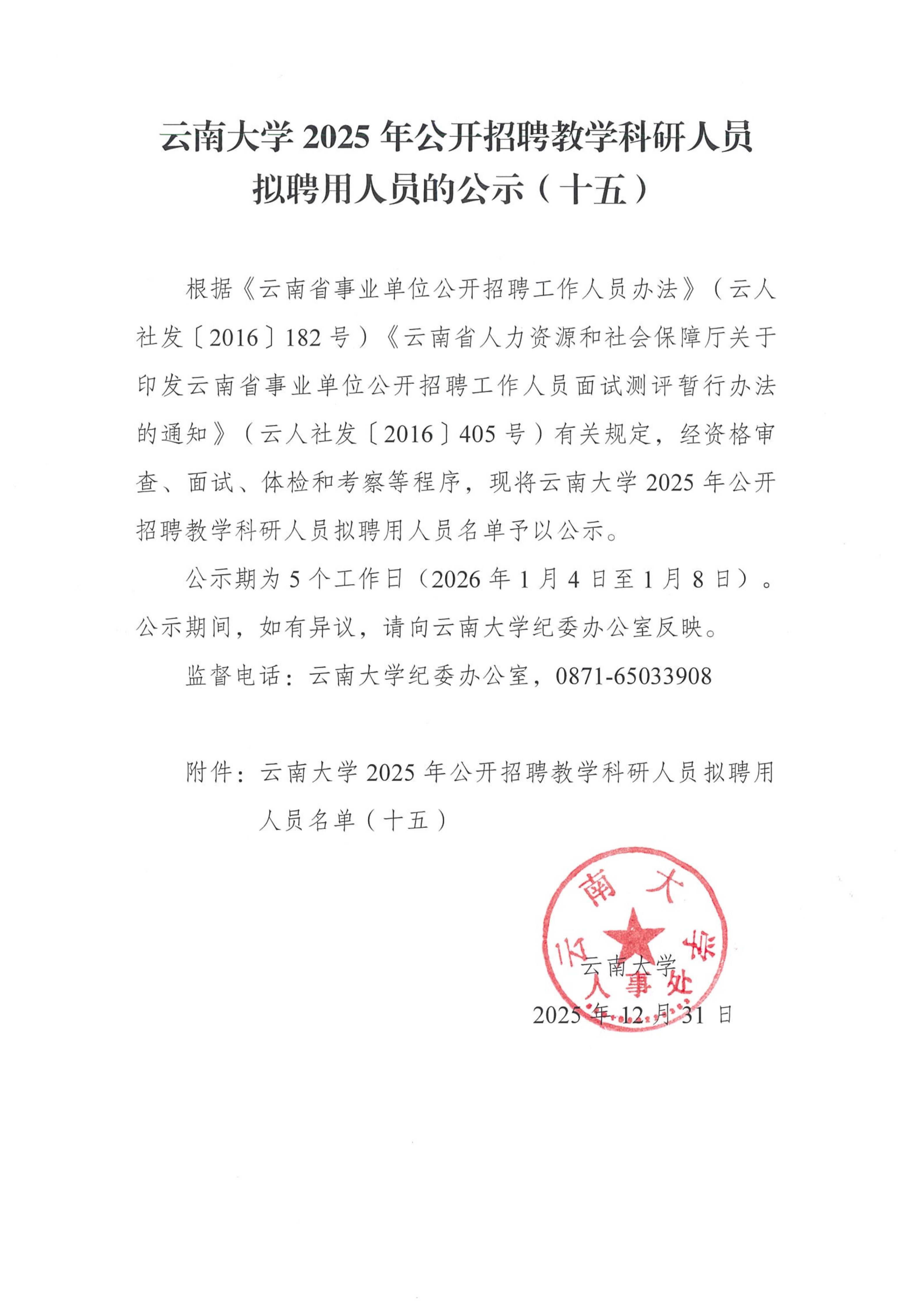云南大学2025年公开招聘教学科研人员拟聘用人员的公示(十五)