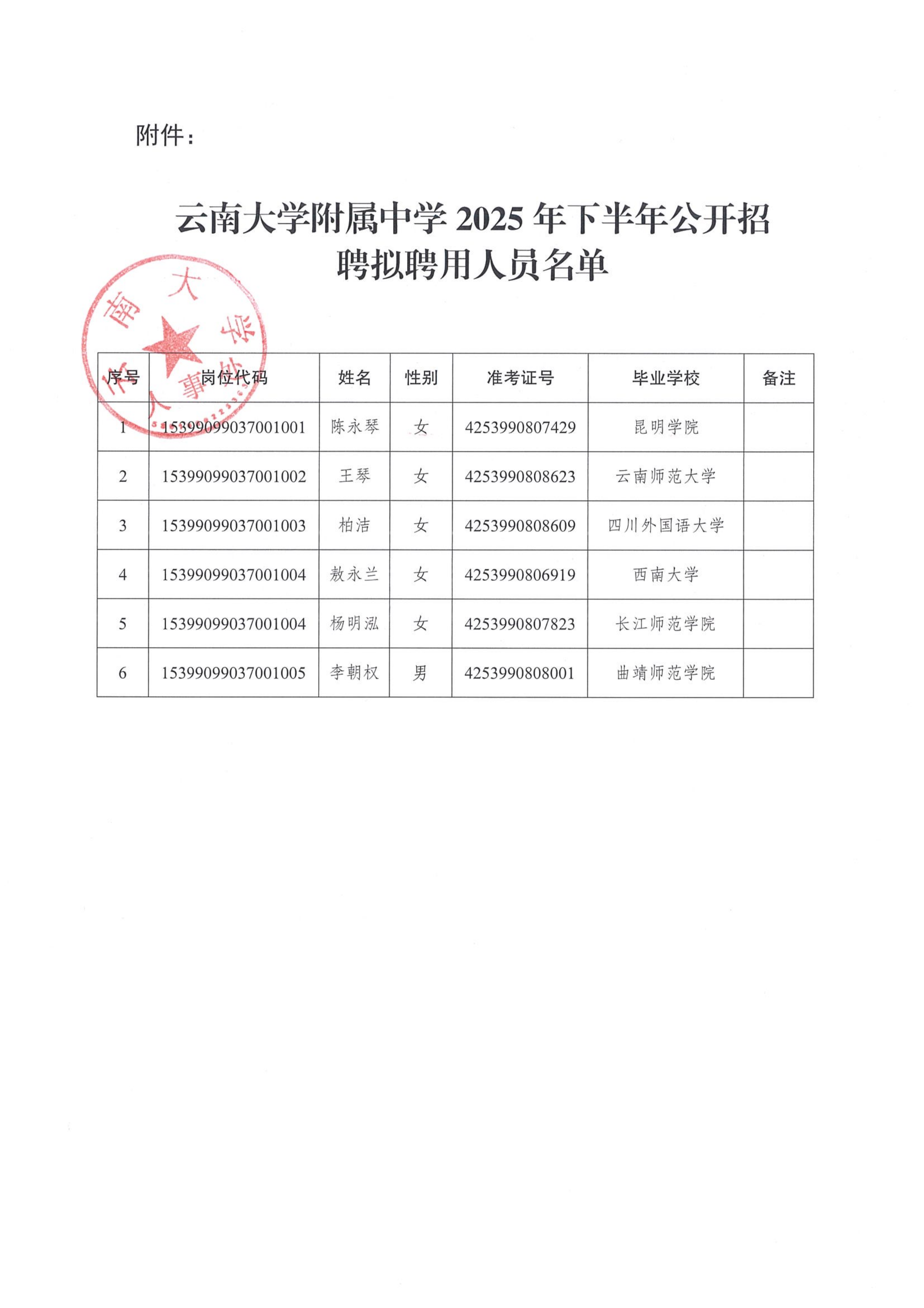云南大学附属中学关于2025下半年公开招聘拟聘用人员的公示.pdf
